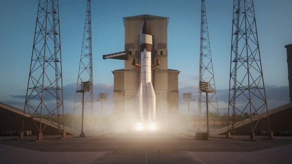 Aperçu d’Ariane 6 en mode vol habité. On note la passerelle classe façon SpaceX !