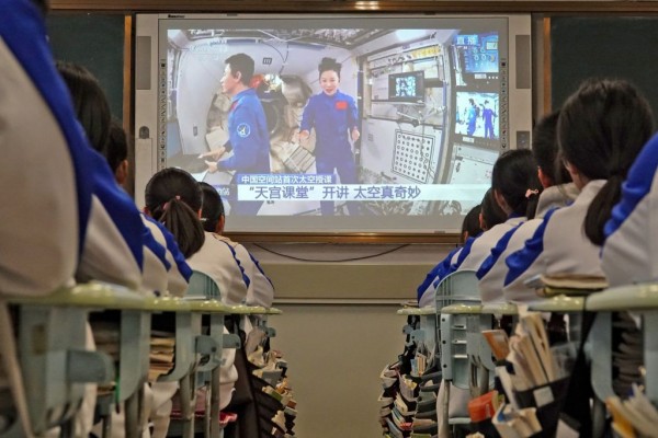 Nouvel an lunaire 2022, l’équipage de la station chinoise explique sa mission à des élèves. La Chine prend très au sérieux la formation scientifique de sa population.
