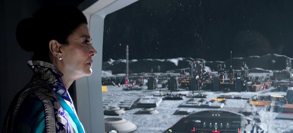 Avasarala, gouverneuse des Nations-Unies, sur la colonie lunaire. Elle est incarnée par l’excellente Shohreh Aghdashloo.